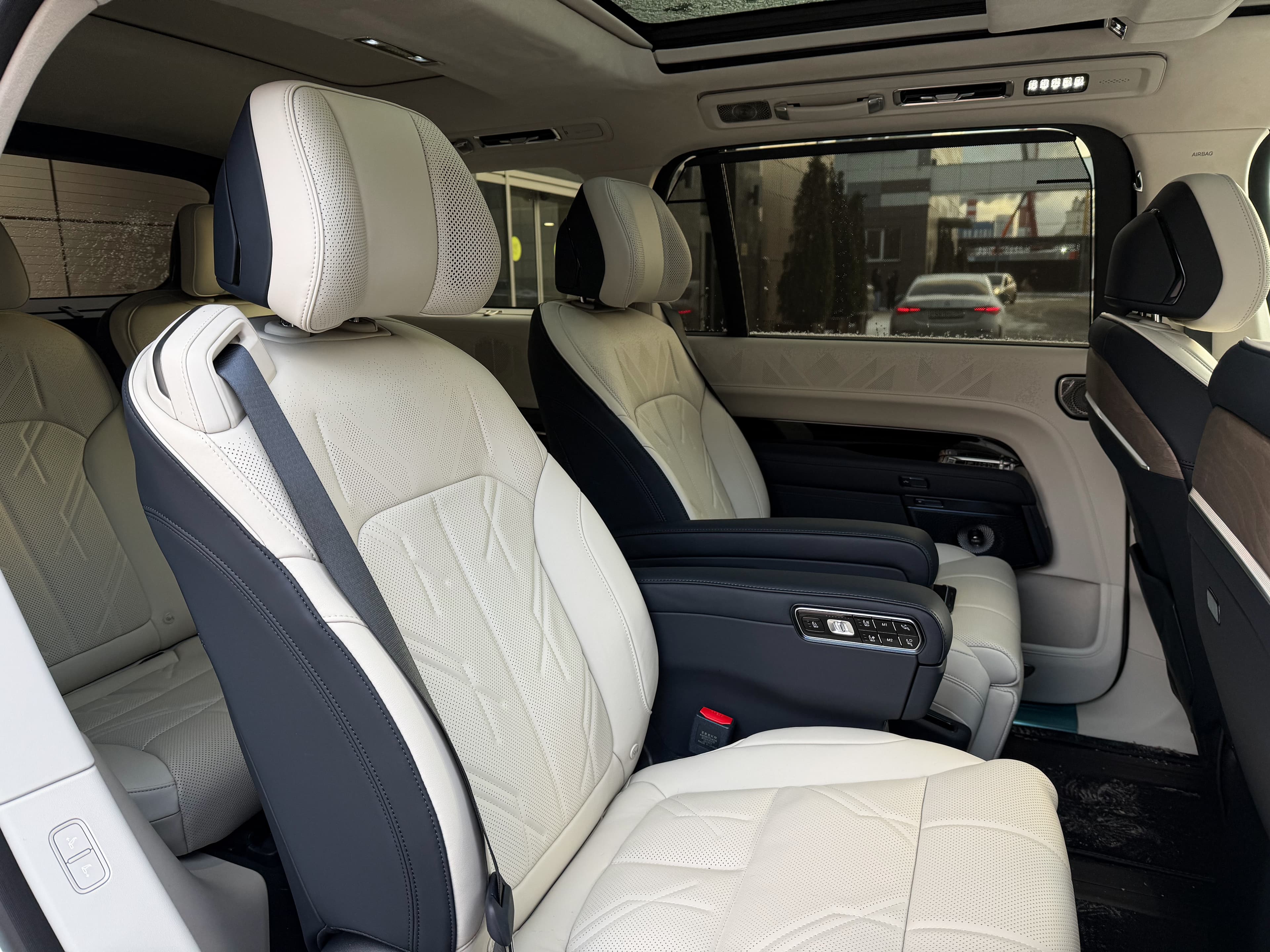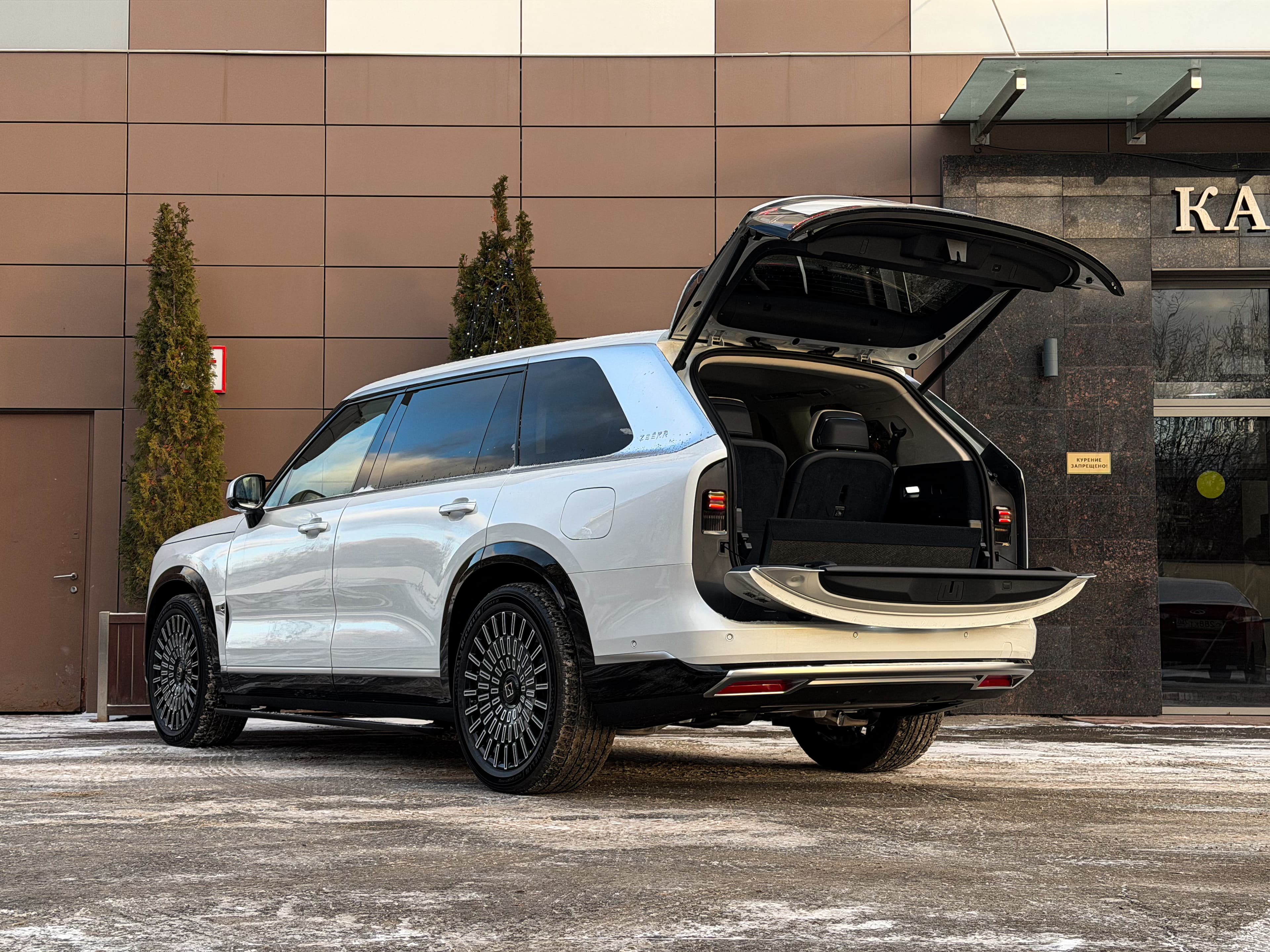 Zeekr 9X 70 кВт⋅ч 2025. Роскошный минивэн F-класса с гибридным полным приводом и мощностью 898 л.с. (660 кВт). Разгон до 100 км/ч — 3,9 с. Элегантный белый цвет, белый салон с вращающимися сидениями, 22" диски. Пневмоподвеска, клиренс 208 мм, быстрая зарядка (20-80% за 9 мин). Идеальный люксовый "шаттл".
